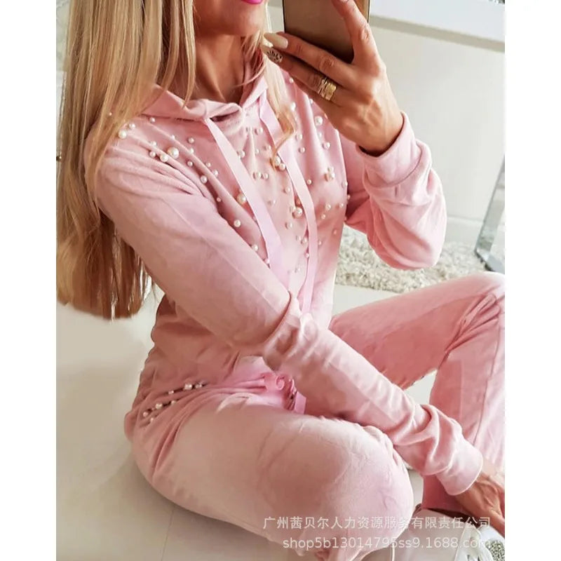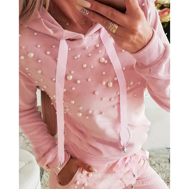 2024 New Women's Clothing Pink Bubble Beads Decorative Hooded Sweater Pullover Sweatpants Trousers Casual Suit 2-Piece Set