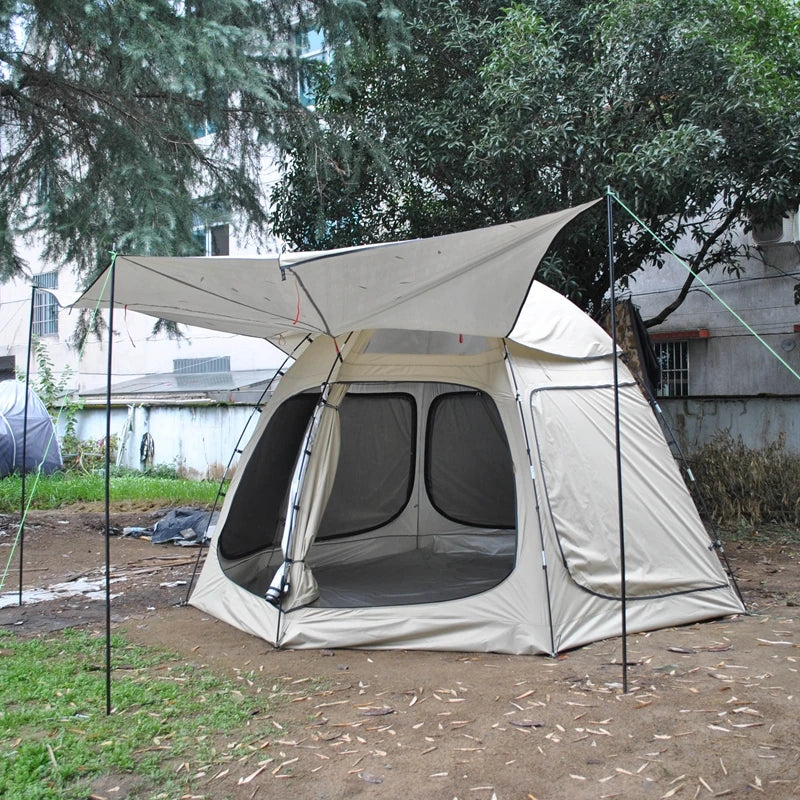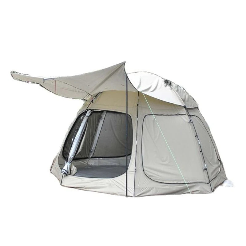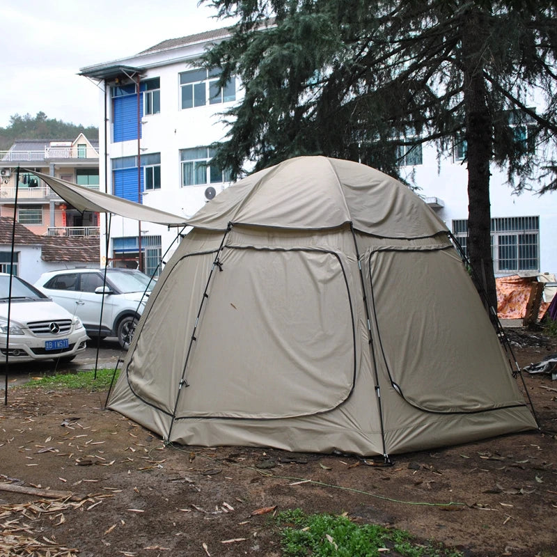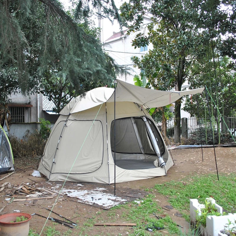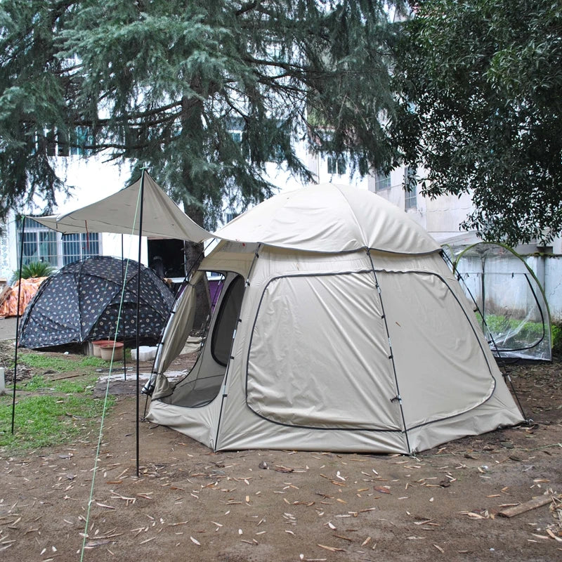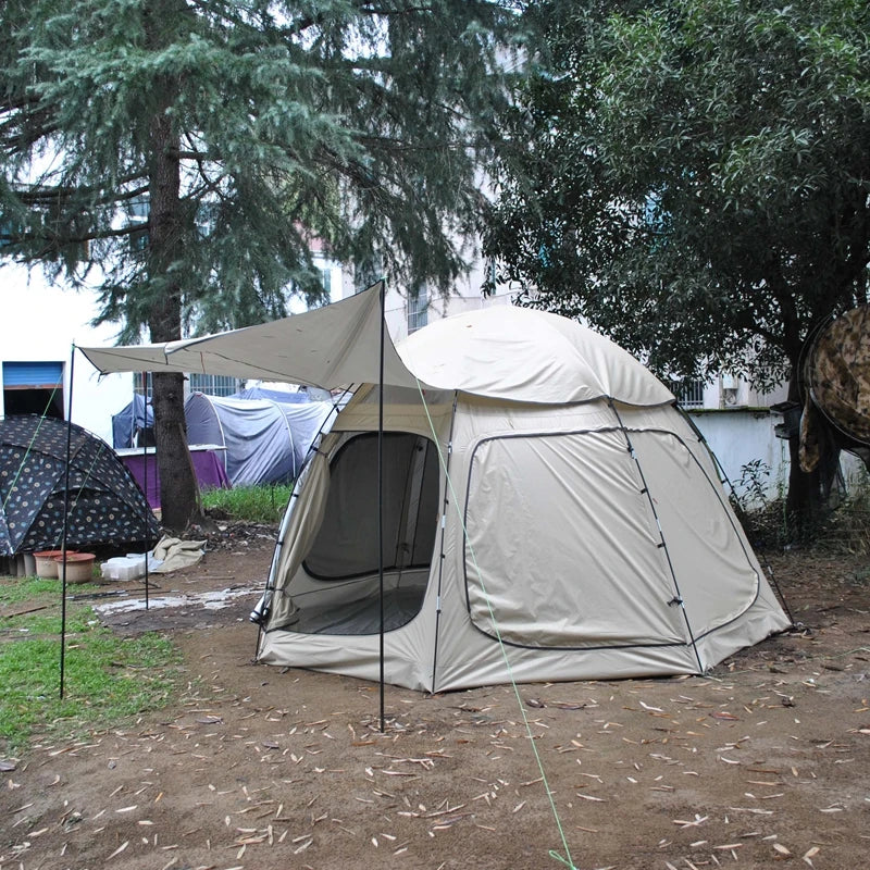 his tent is beautiful, and the overall shape is octagonal in the shape of the space capsule. On the top is a layer of breathable nylon mesh and a layer of special rain-proof cover. Each side opens a door, a total of 8 doors. The door is in the form of double layers. One layer of breathable nylon mesh and one layer of outer curtain are waterproof. The main door has the effect of extending the sky curtain after it is unfolded. With the help of the ceiling pole, a hall outside the tent can be built, The whole tent realizes the expansion function of one room and one hall.