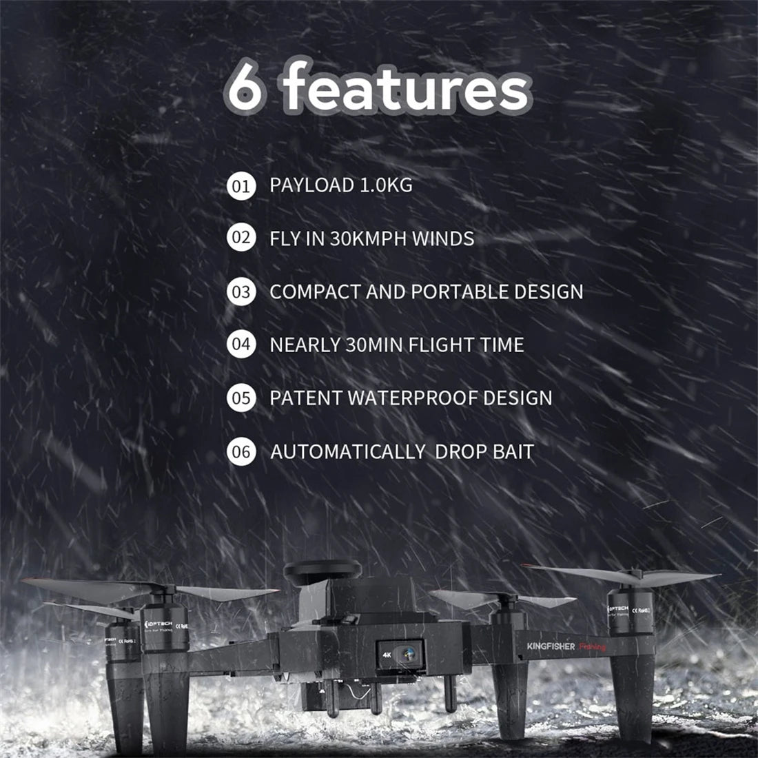KINGFISHER fishing drone has the characteristics of long battery life, strong load capacity, multiple flight modes, waterproof and windproof, etc. In addition, this waterproof fishing drone also has real-time video monitoring, multifunctional projector, all-round security system.
