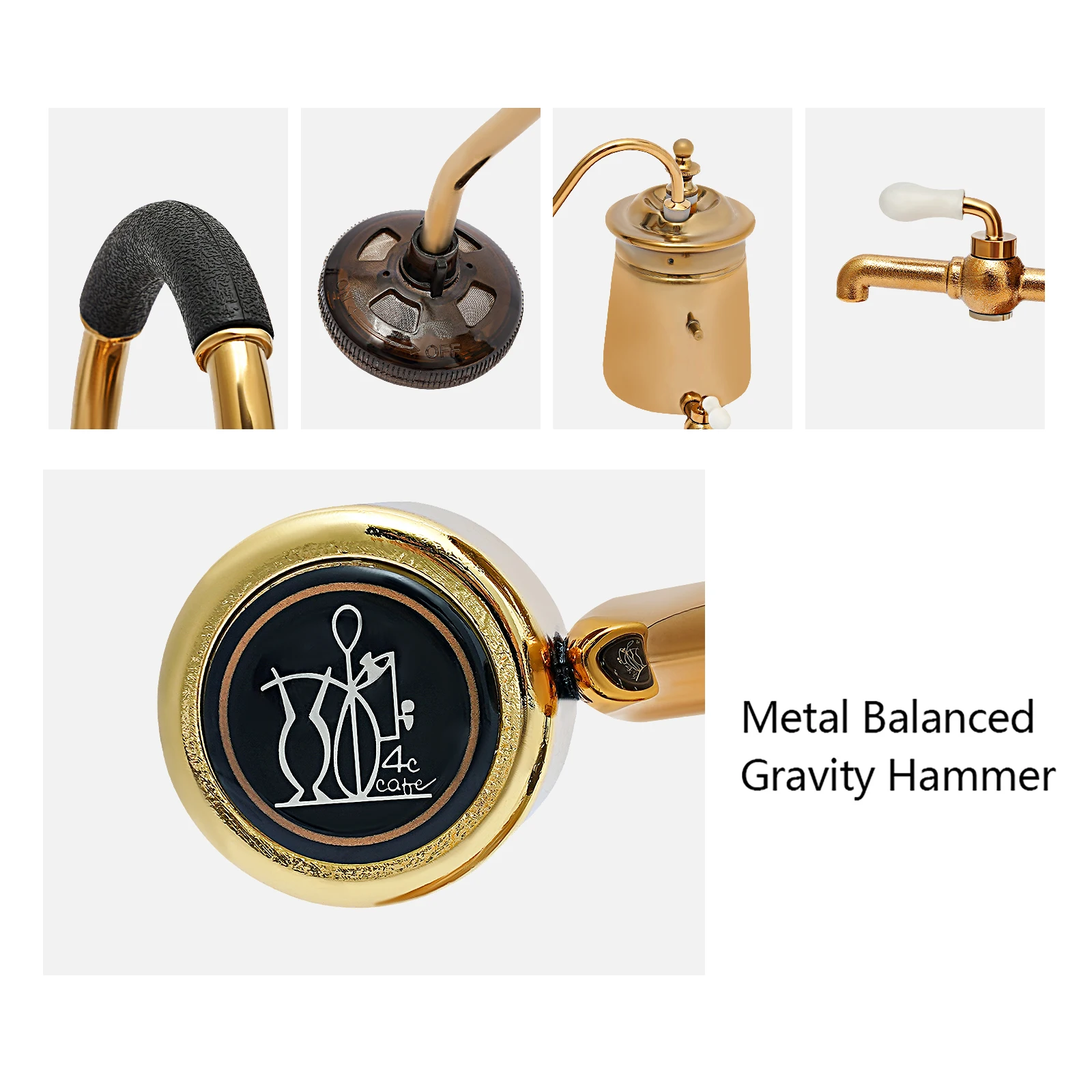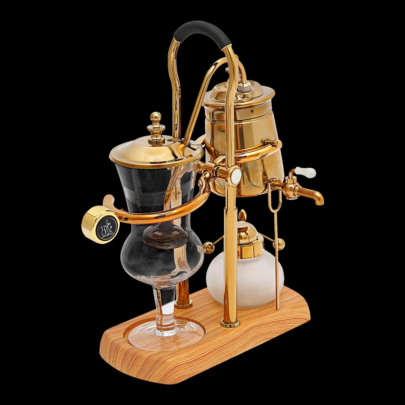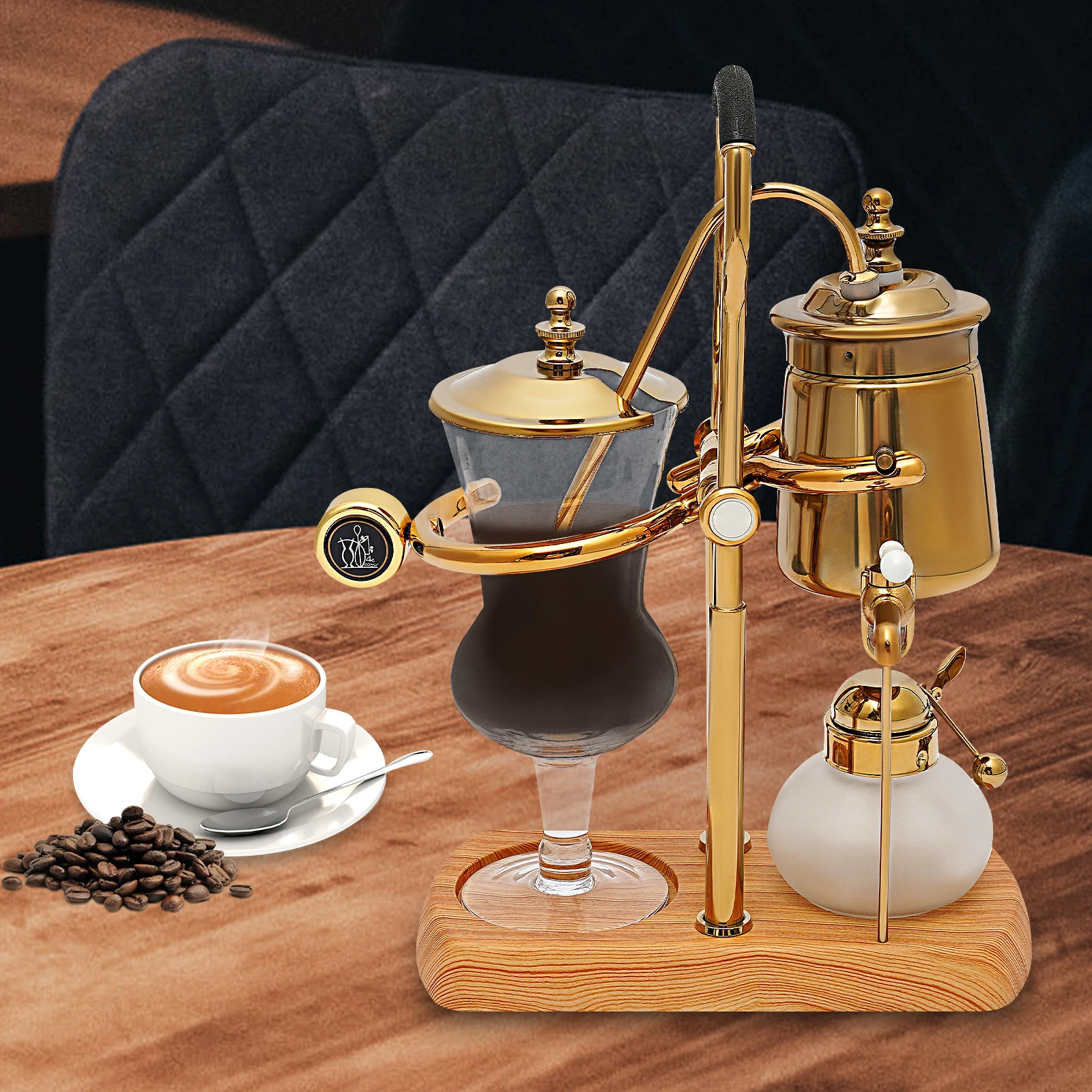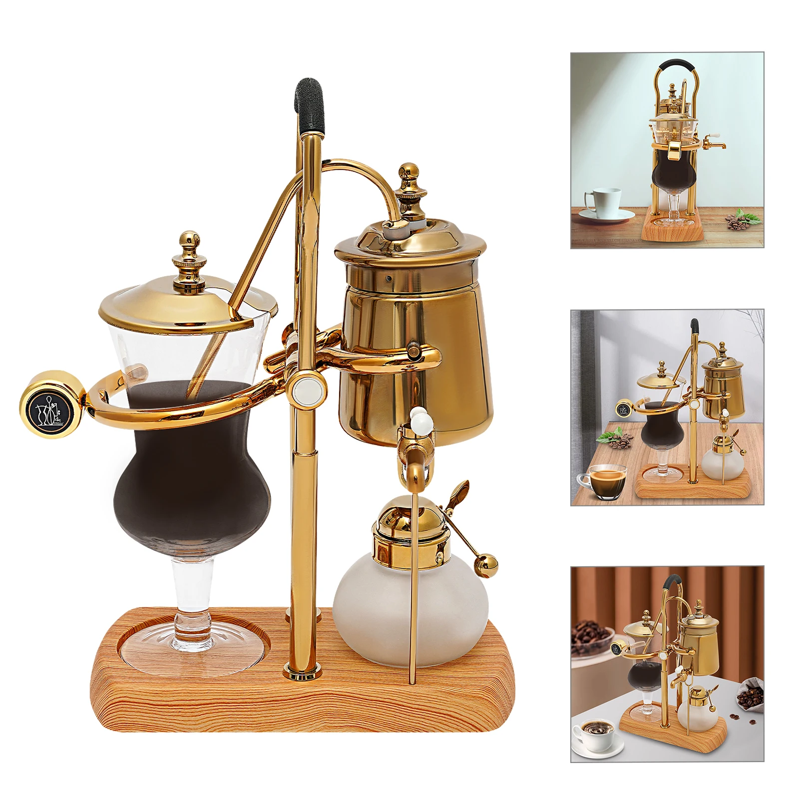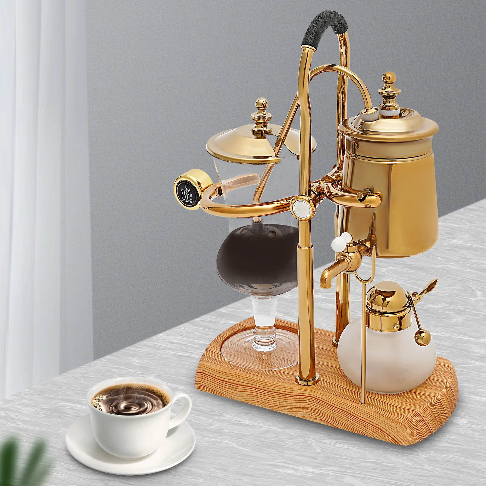 CLASSY PLATED: In classic gold ridged fulcrum, decorative holed balance lever and matching wooden board base. A real conversation starter and center of attraction for it exquisite design, brews in style and delicious coffee.