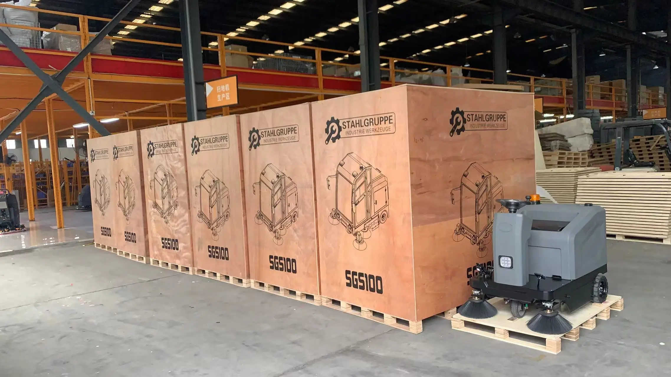 S1250B driving sweeper will be protected with protective film and put on a multi-wood tray for sealing. The wooden box is full fumigation wooden