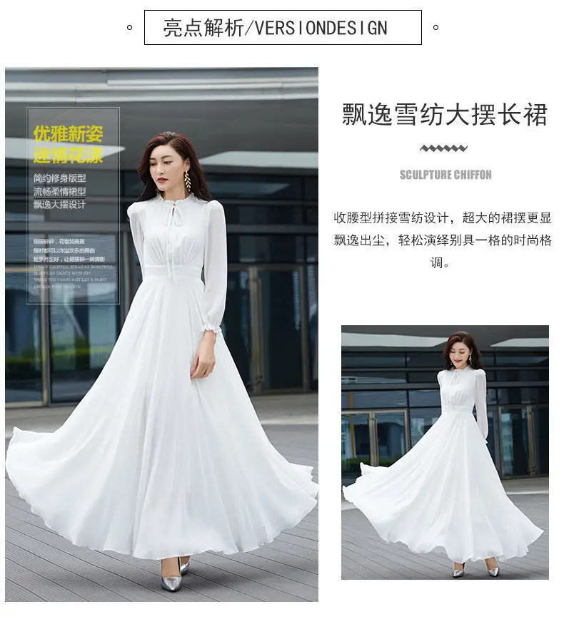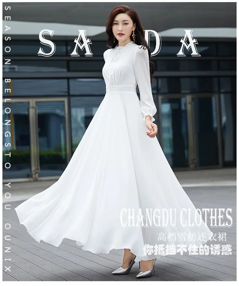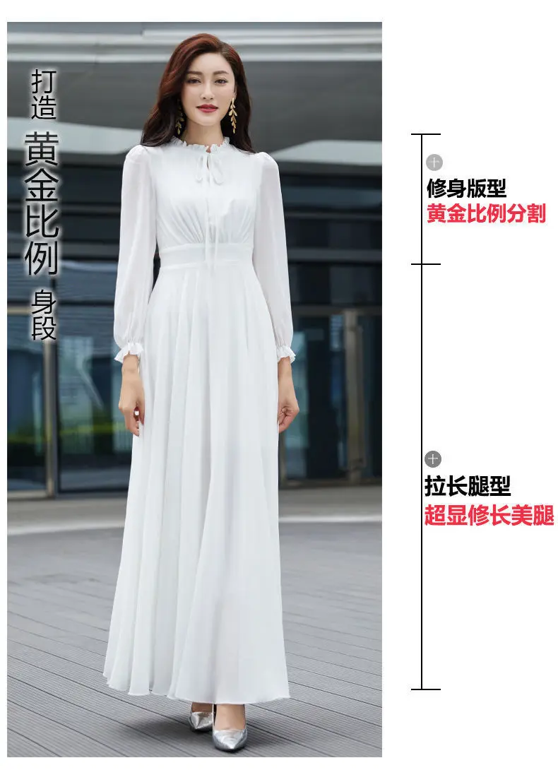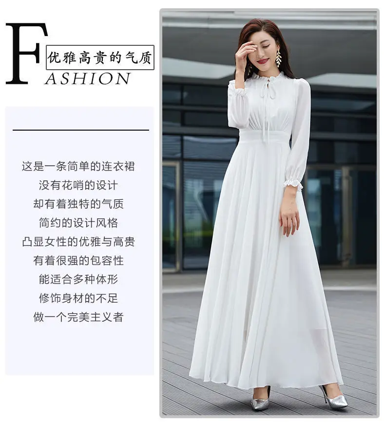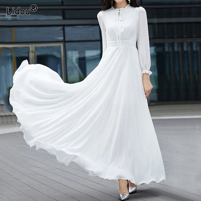 Elegant Casual O-neck Long Sleeve White Slender Dresses Spring Autumn Fashion Belt Empire Chiffon Solid Color Women's Clothing