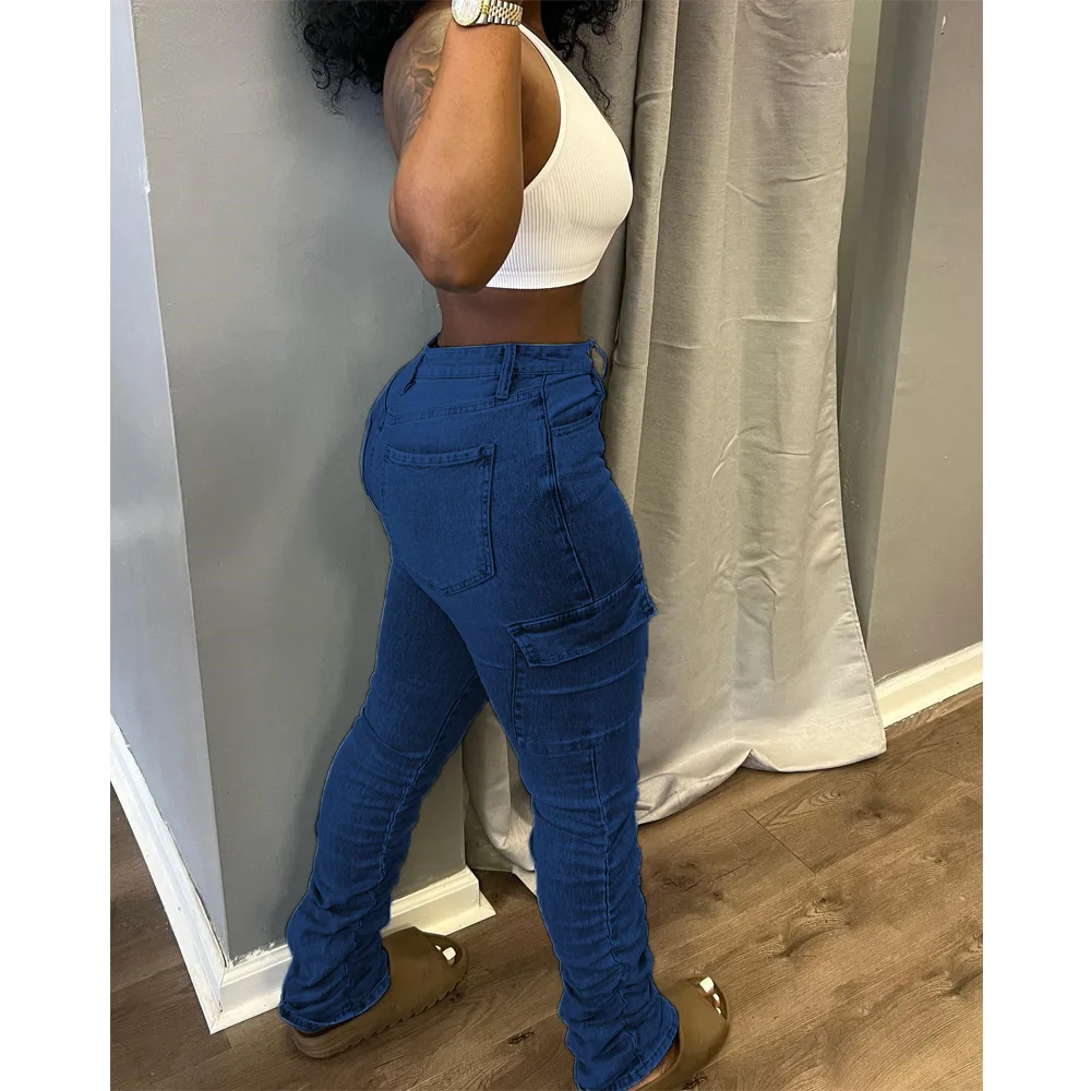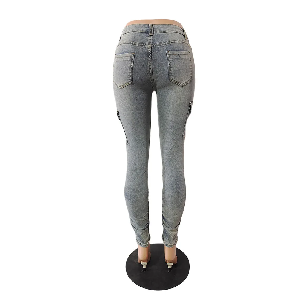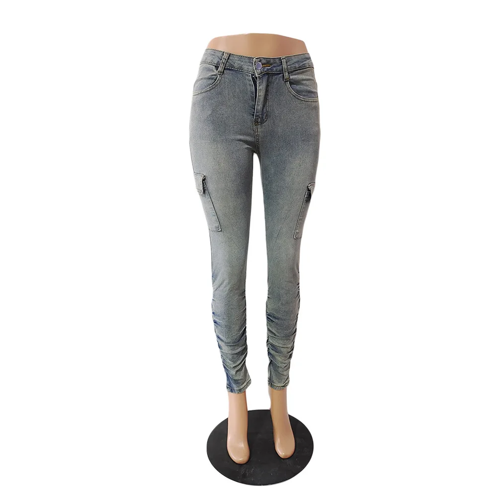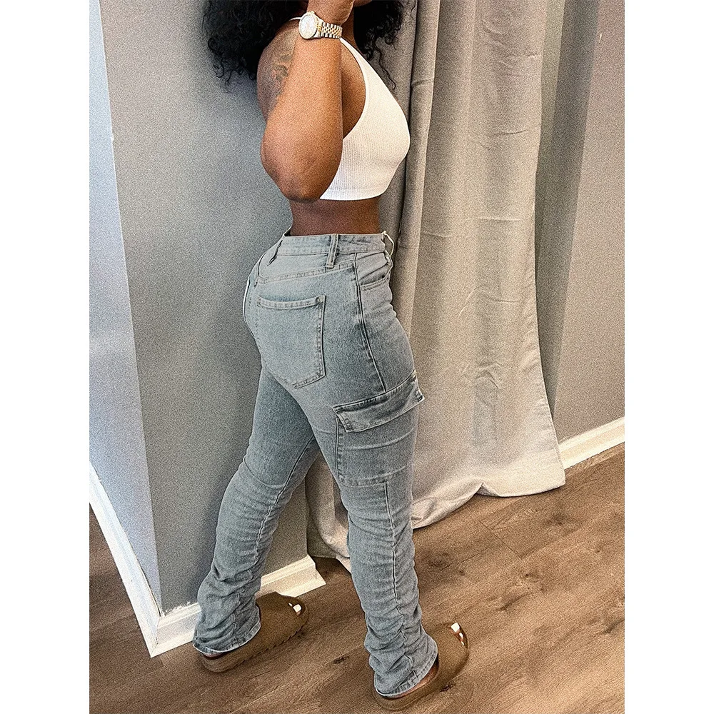 European and American Clothing Ins Smocked Side Pockets, Fashionable and Personalized Low-waist High-elastic Jeans