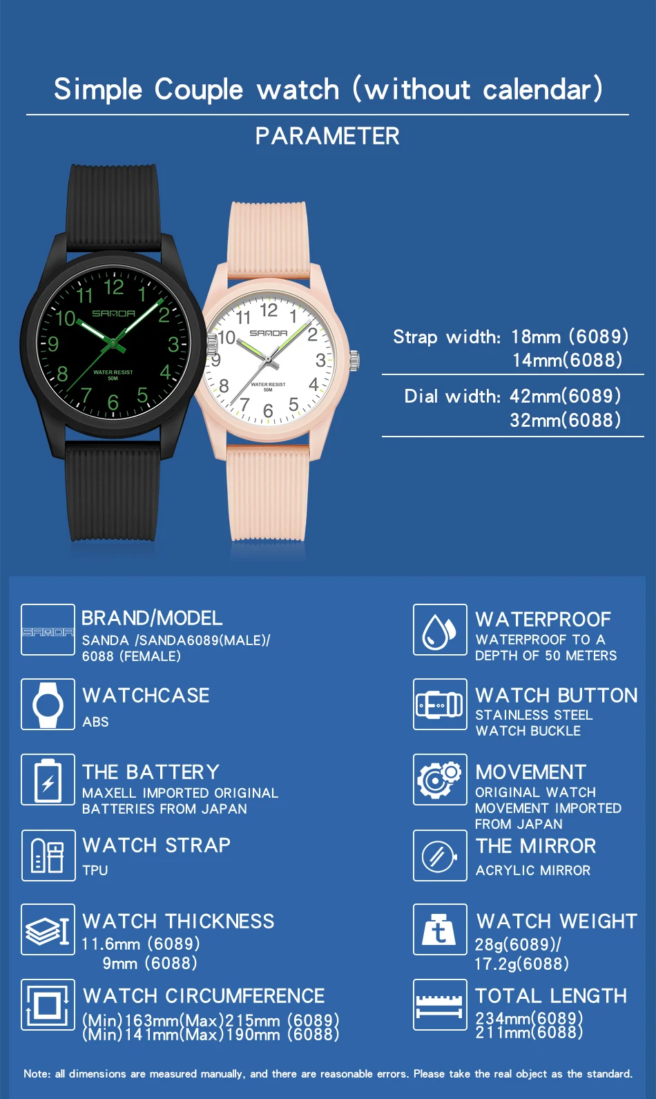 Fashion Sanda Top Brand Simple Quartz Original Women Men Wristwatch Waterproof Outdoor Clock New Style Students Wrist Watches