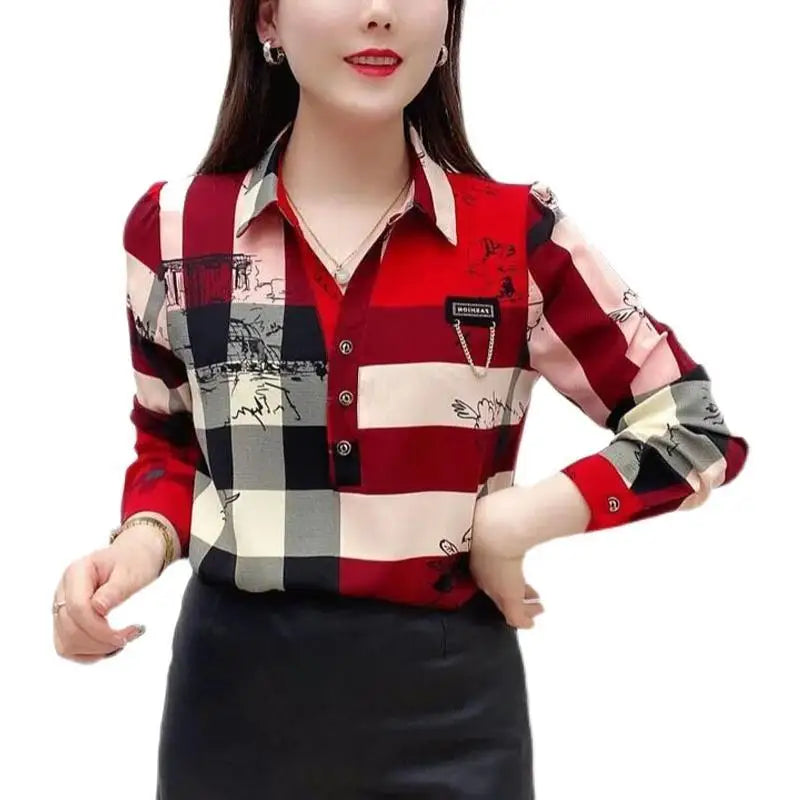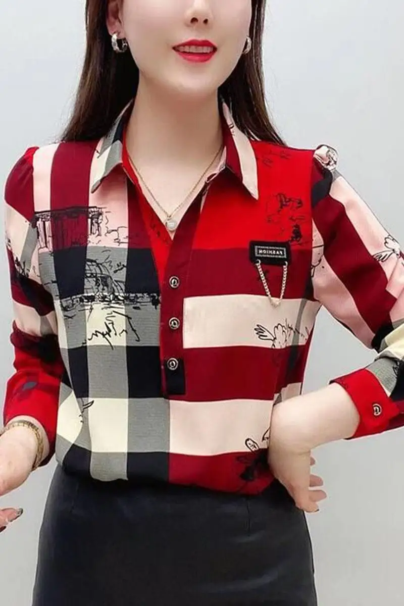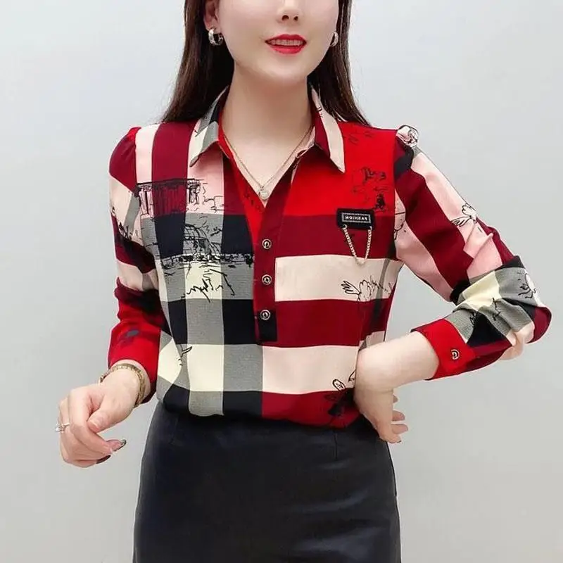 Female All-match Vintage Plaid Printed Shirt Fashion Button Casual Polo-Neck Pullovers Blouse Spring Autumn Women's Clothing