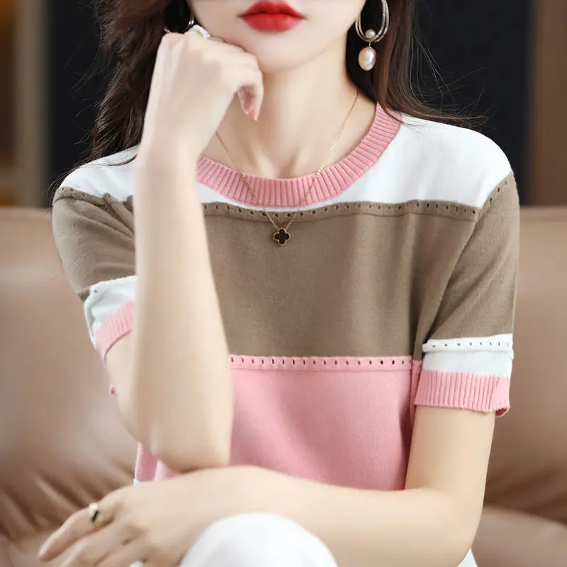 Korean Fashion Hollow Out Patchwork Knitted Blouse Women's Clothing 2023 Summer New O-Neck short Sleeve Casual Pullovers Shirt
