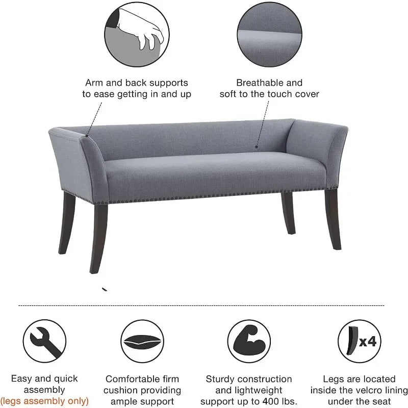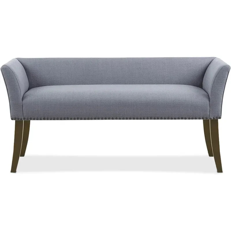 - Upgrade your space with our modern small bench. Stylish blue cover, espresso wood legs, and bronze nailhead accents. Arm and backrests provide support and elegance