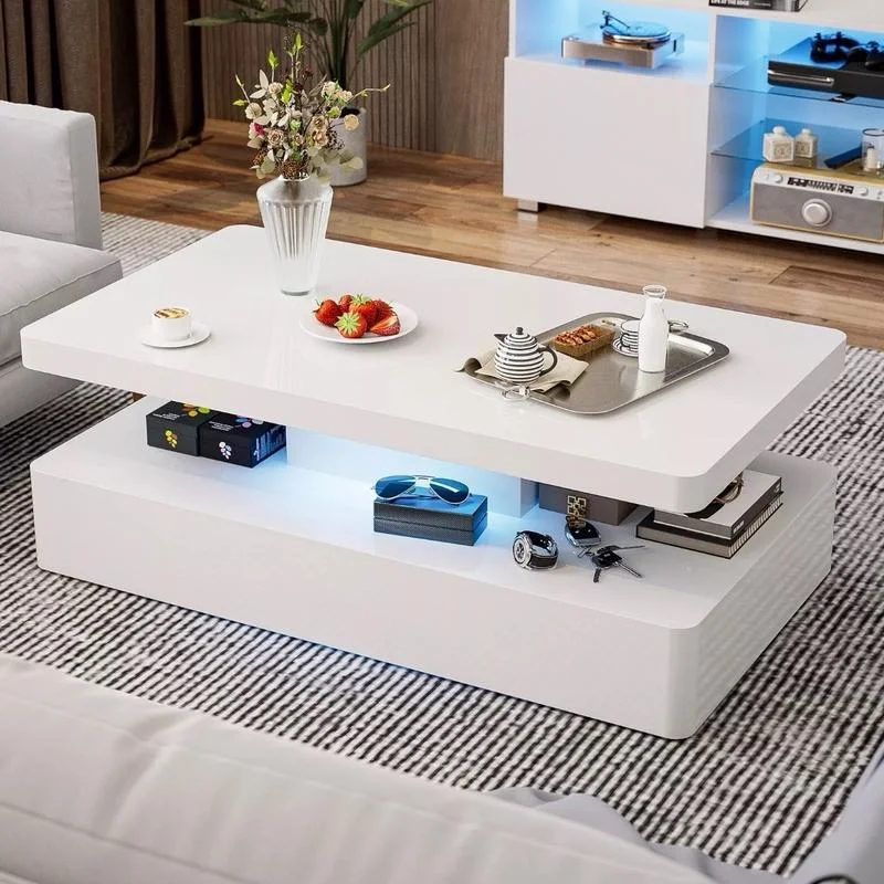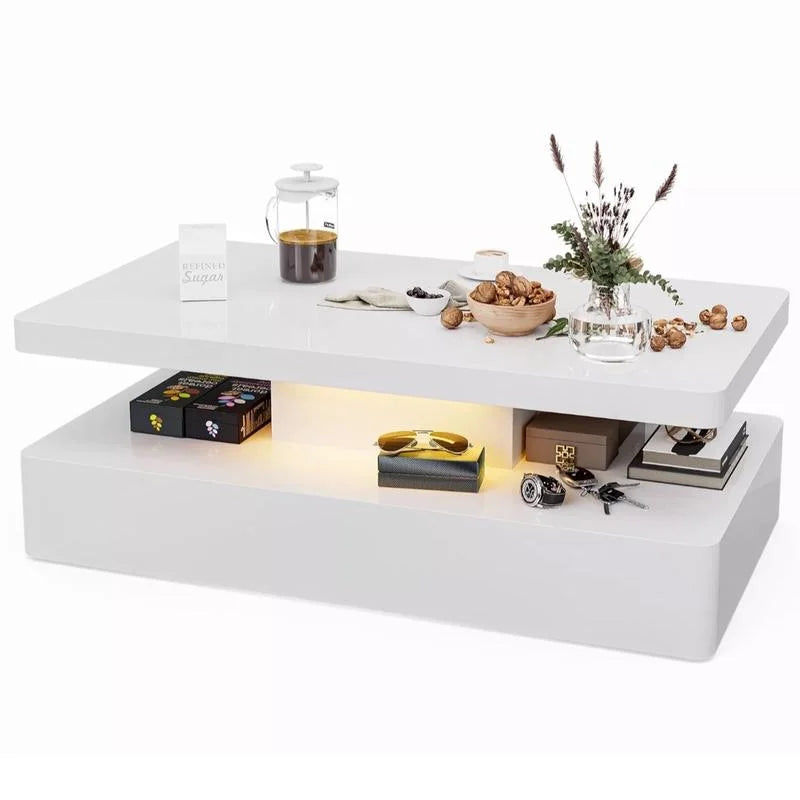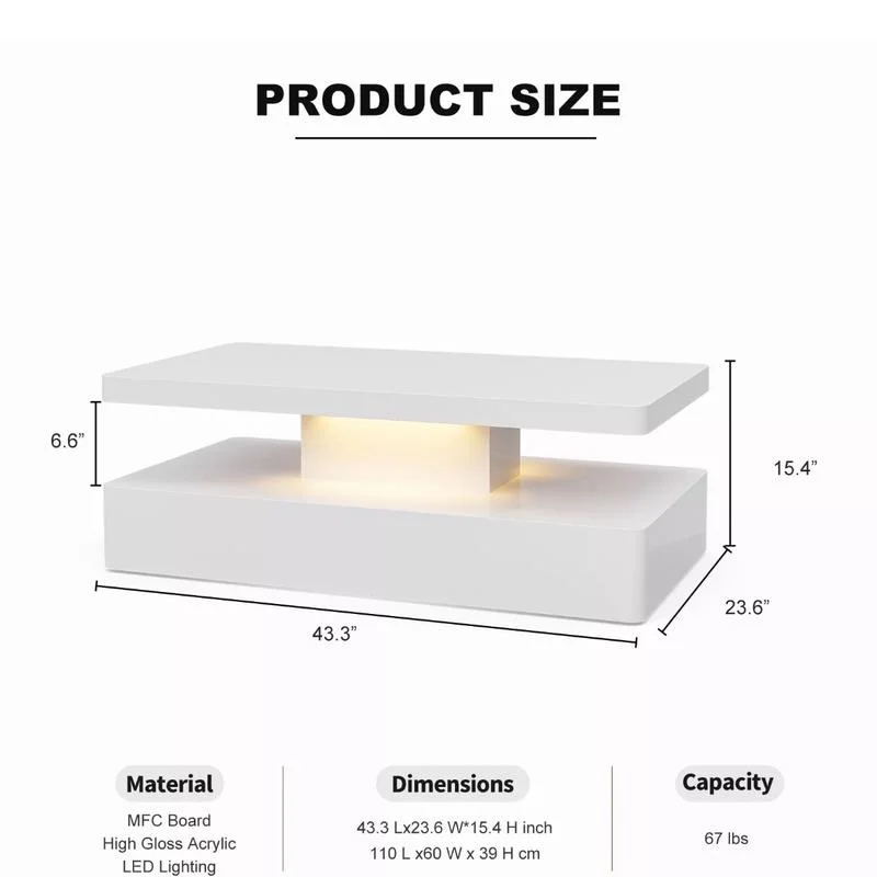 Modern High Glossy White Coffee Table with 16 Colors LED Lights,Rectangle Table.
