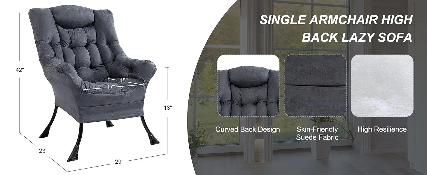 Modern Soft Accent Chair Living Room Upholstered Single Armchair High Back Lazy Sofa (Cool Grey)