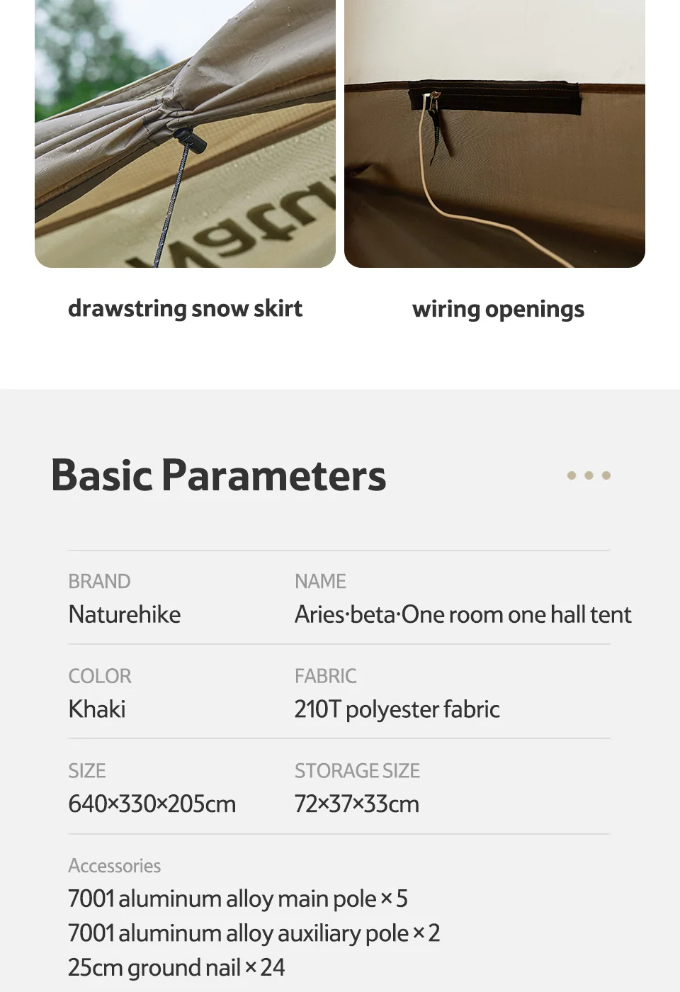 Accessories: 7001 aluminum alloy main pole * 5 7001 aluminum alloy auxiliary pole * 2 25cm ground nail * 24 350cm wind rope * 10 (already tied to the tent) Tent straps * 1