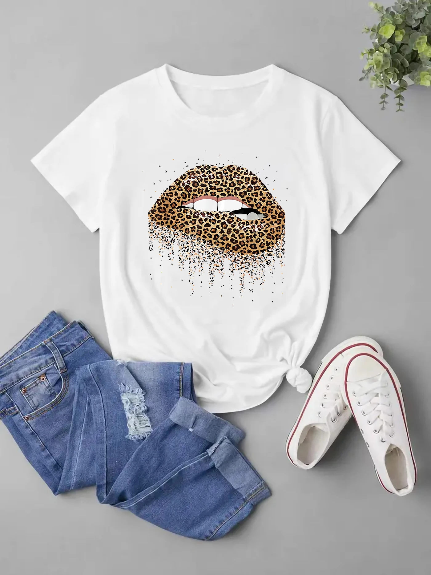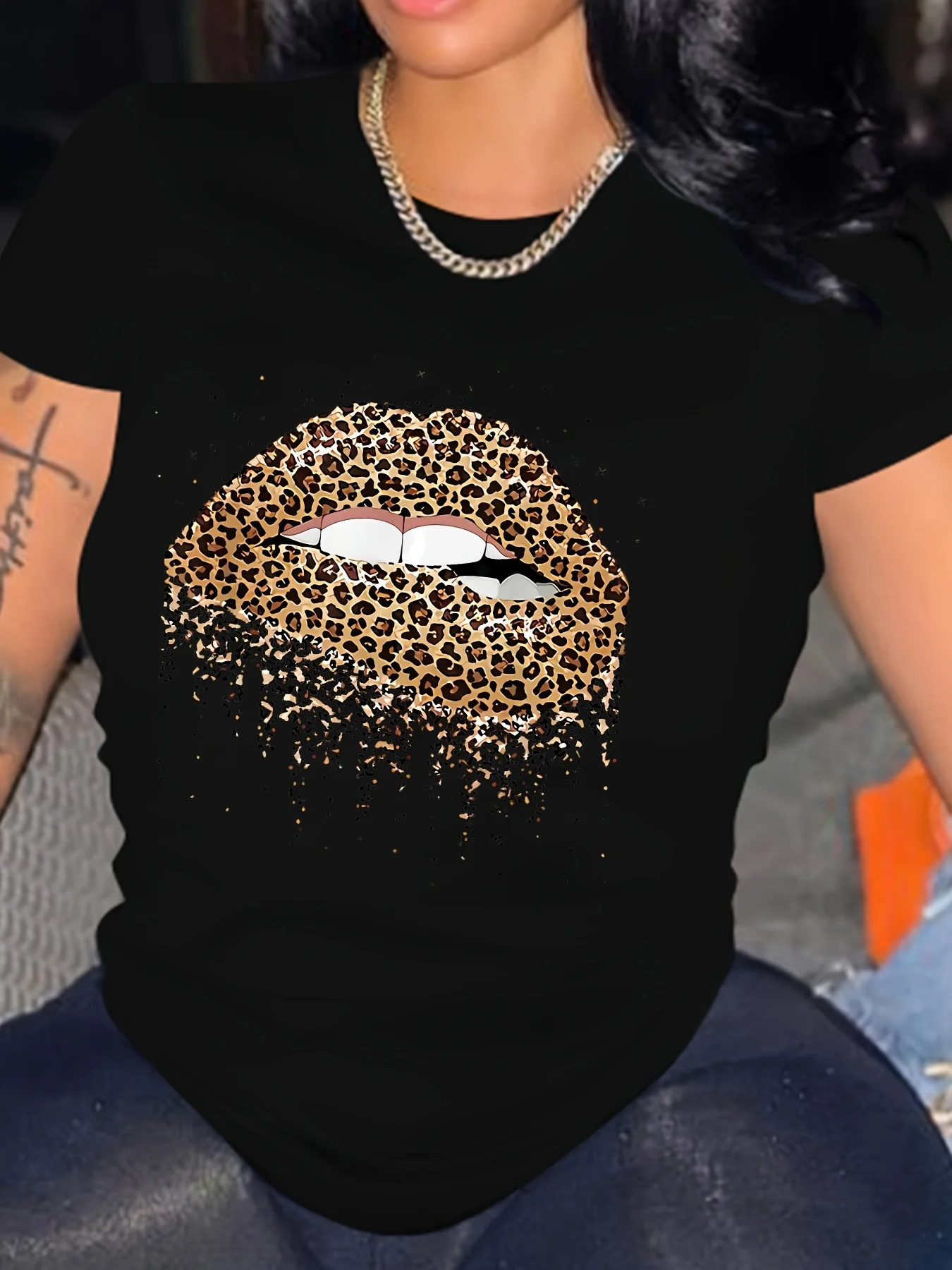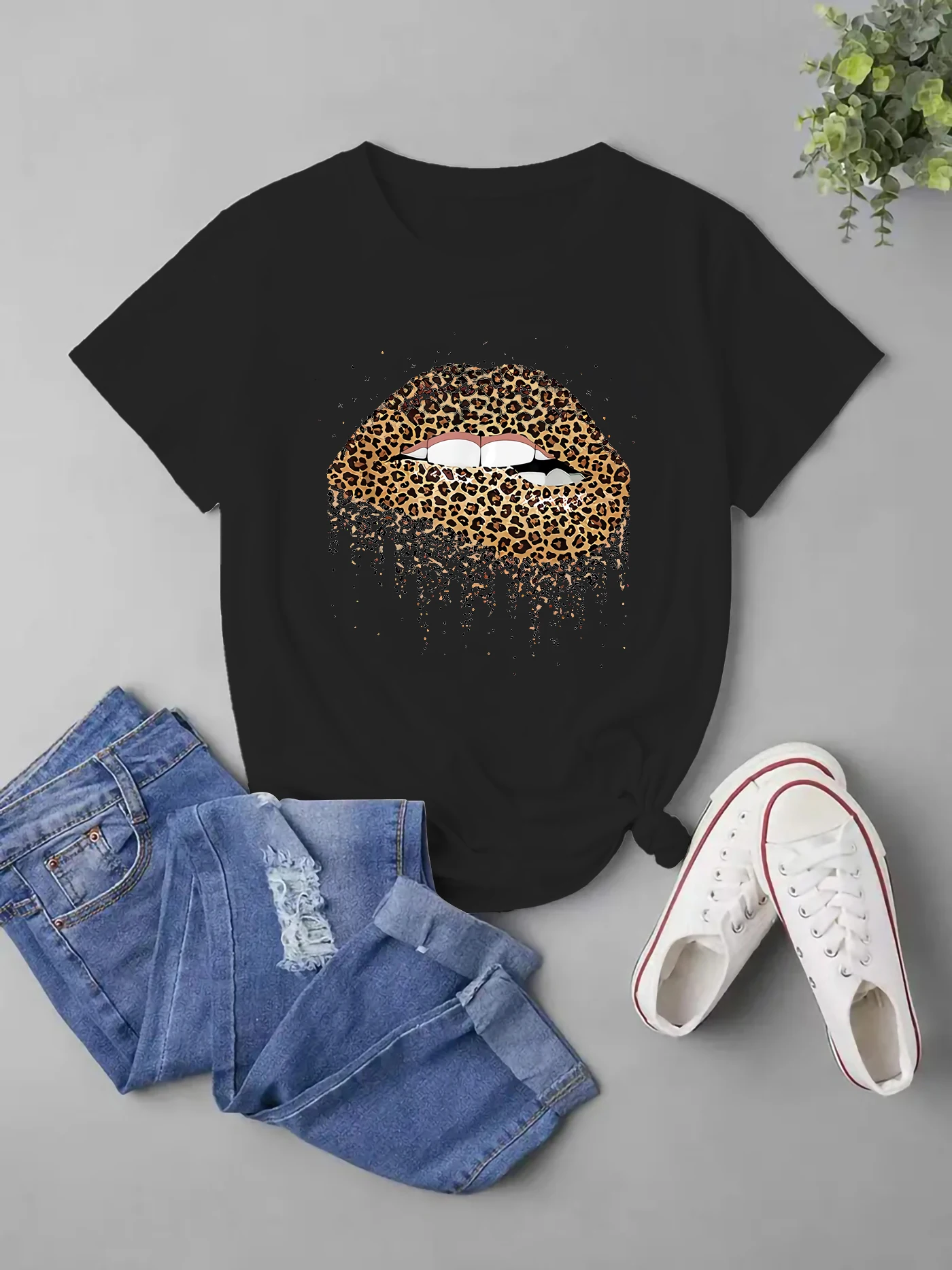 Plus Size Leopard Lips Graphic Tee Shirt, Valentine's Day Crew Neck Short Sleeve Casual Everyday Tops, Women's Clothing