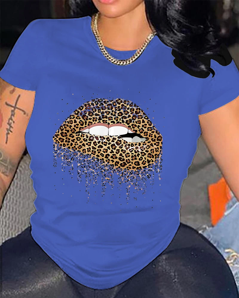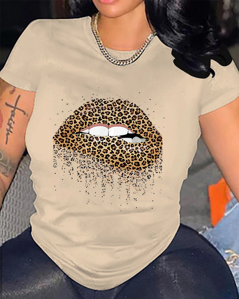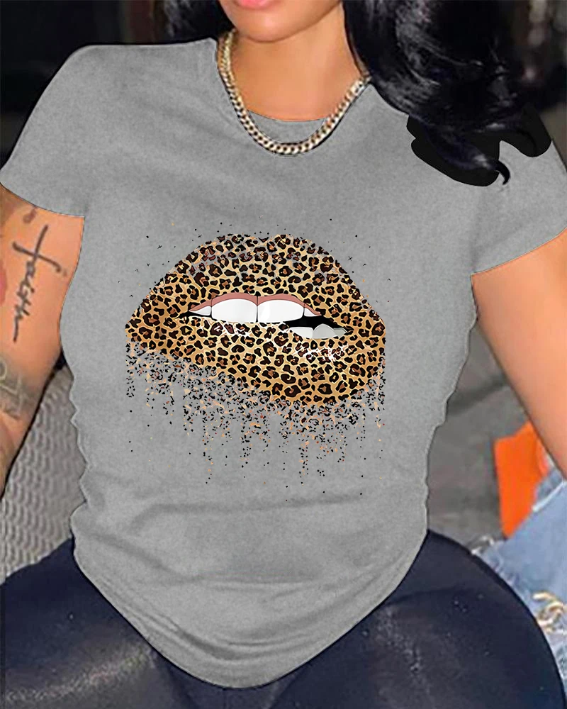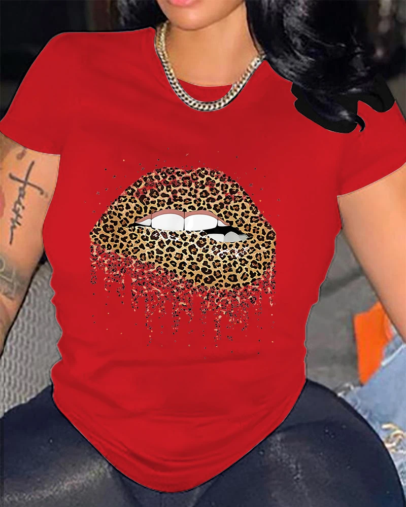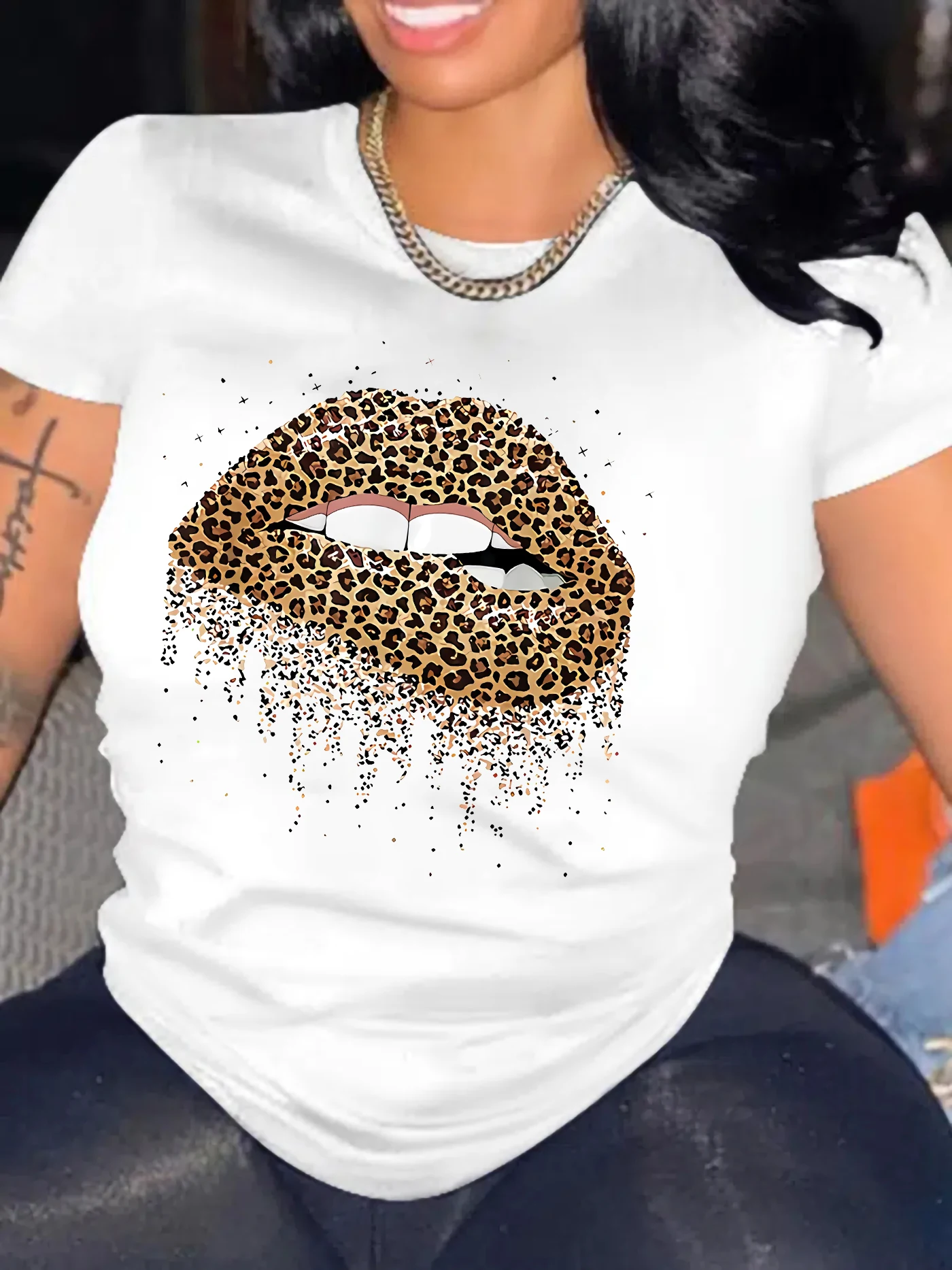 Plus Size Leopard Lips Graphic Tee Shirt, Valentine's Day Crew Neck Short Sleeve Casual Everyday Tops, Women's Clothing