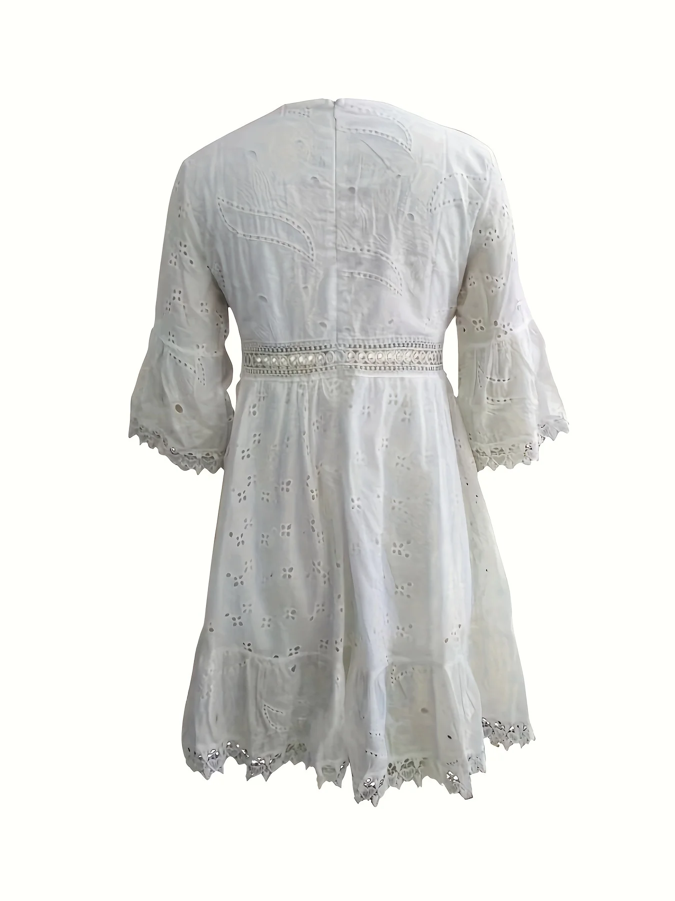 Solid Eyelet V Neck A-line Dress, Casual Tassel Three-quarter Sleeve Dress, Women's Clothing