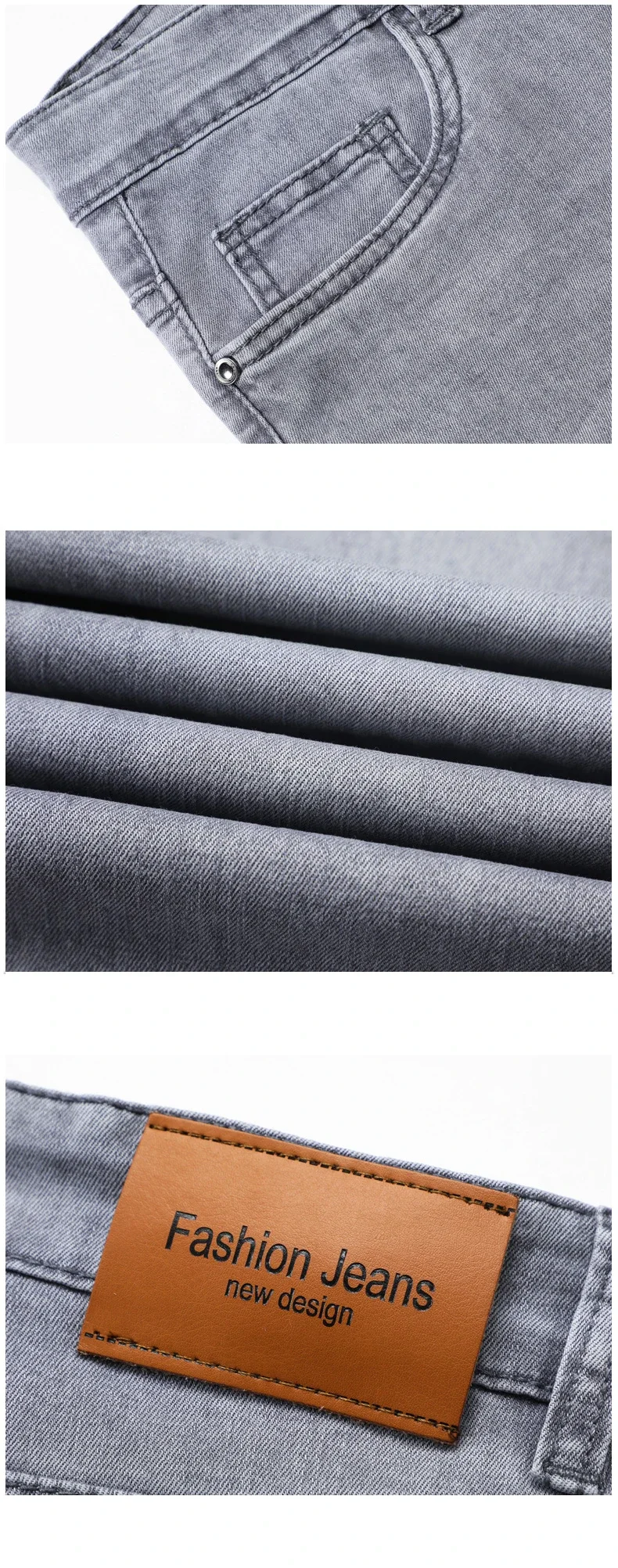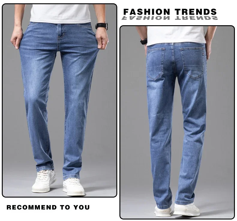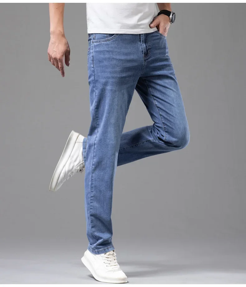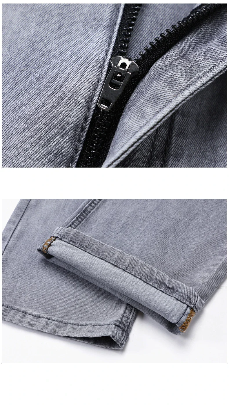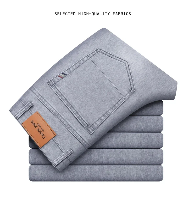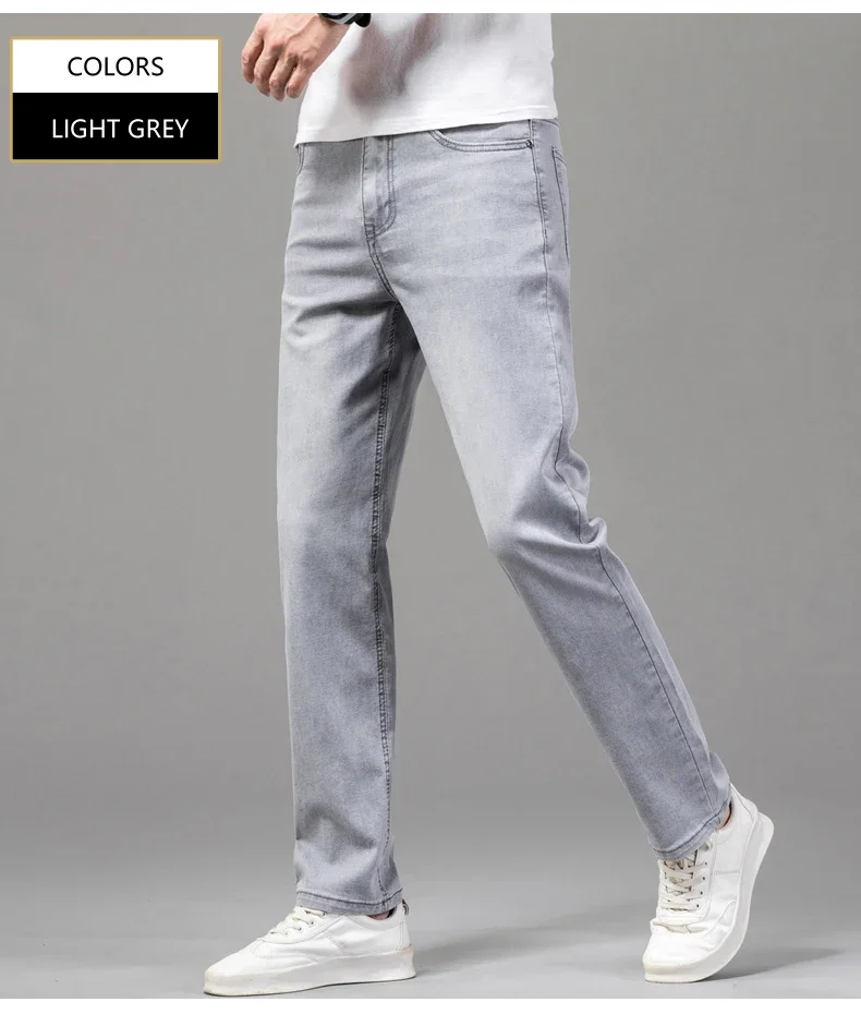 Summer Thin Men's Stretch Cotton Soft Denim Jeans Fashion Gray Business Slim Straight Casual Pants High Quality Brand Trousers