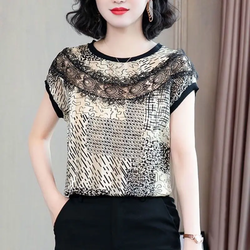 Vintage Printed O-Neck Spliced Hollow Out Lace Blouse Women's Clothing 2023 Summer New Oversized Casual Pullovers Commuter Shirt