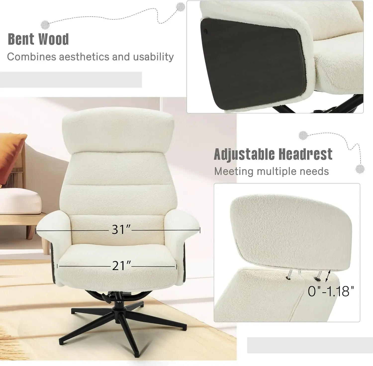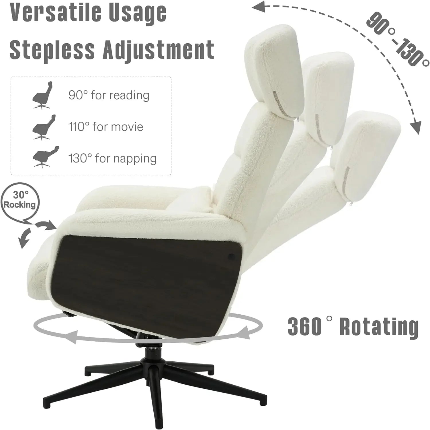 - 🎁Customize Your Comfort: Our teddy swivel recliner chair features an adjustable backrest and headrest.This glider rocker chair has an adjustable backrest angle between 90 degrees and 130 degrees, which can satisfy your needs for reading, resting and taking a shallow nap.