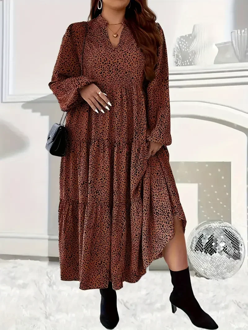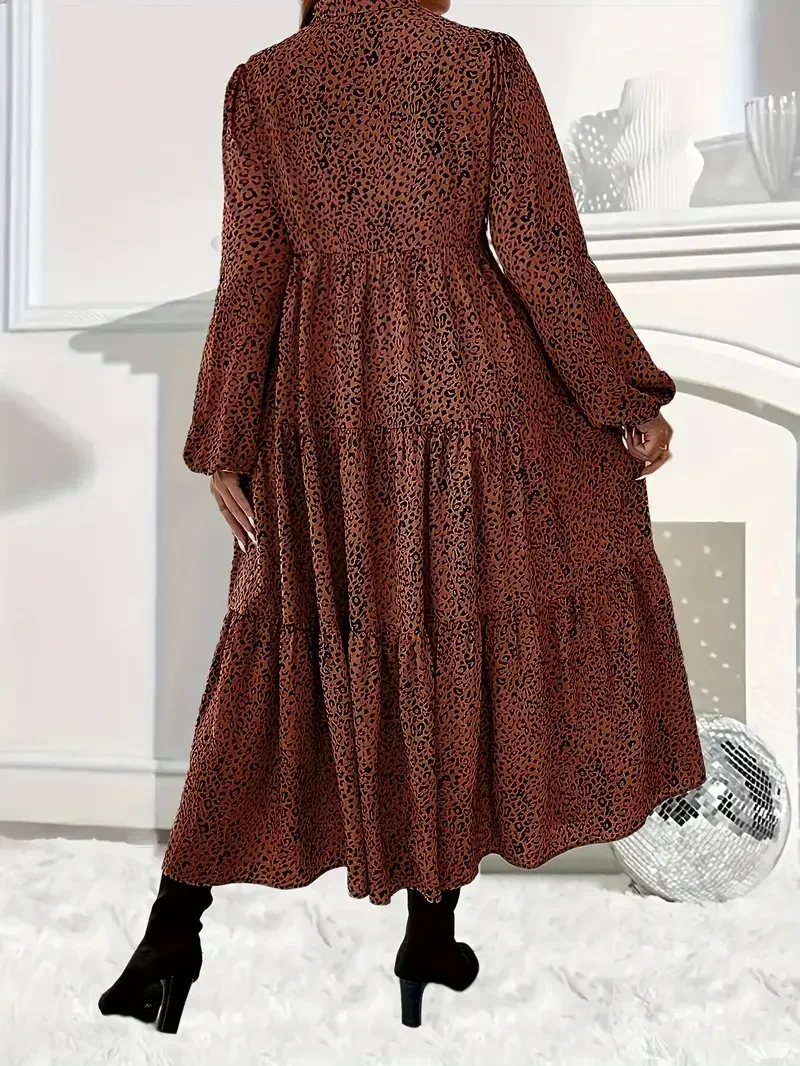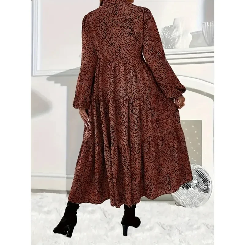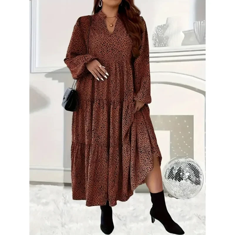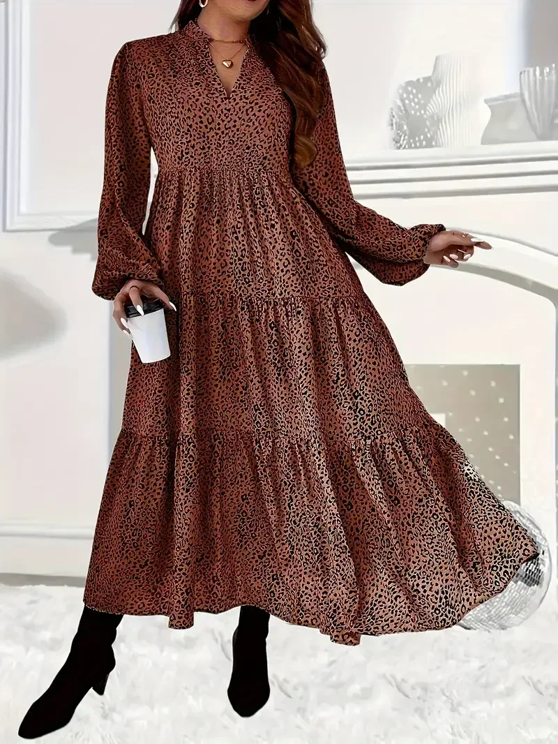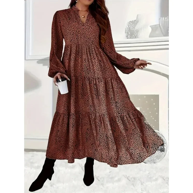 Women's Dress Long Casual Plus Size Leopard Fashion 1XL-5XL Print Tiered Long Dress Ladies Casual Notch Neck Long Sleeve Dress Women's Clothing
